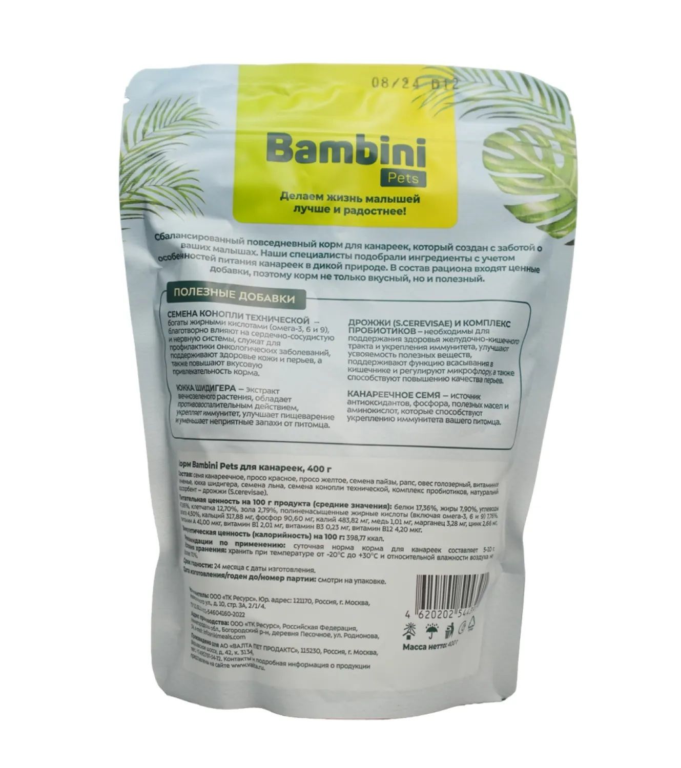 Состав: семя канареечное, просо красное, просо желтое, семена пайзы, рапс, овес голозерный, витаминные гранулы, юкка шидигера, семена льна, семена конопли технической, комплекс пробиотиков, натуральный адсорбент - дрожжи (S.cerevisae). Питательная ценность на 100г : белки 14,66%, жиры 17,85%, углеводы 47,86%, клетчатка 7,70%, зола 3,79%, полиненасыщенные жирные кислоты (включая Омега 3-6-9) 7,76%, влага 4,50%, кальций 157,88 мг, фосфор 421,60 мг, калий 483,82 мг, медь 1,01 мг, марганец 3,28 мг, цинк 2,66 мг, Витамин А 41,00 мкг, Витамин В1 2,01 мг, Витамин В3 0,23 мг, Витамин В12 4,20 мкг Энергетическая ценность на 100г: 398,77 ккал.