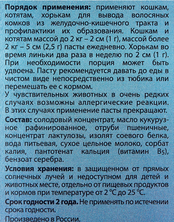 Кошкам и котятам массой до 2-х кг - 2 см (1 г), массой более 2 кг - 5 см (2,5 г) пасты ежедневно. Хорькам во время линьки два раза в неделю по 2 см (1 г). При необходимости порция может быть удвоена. Пасту можно давать в чистом виде непосредственно из тюбика или перемешав ее с кормом. Рекомендуется давать пасту до еды. -