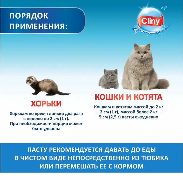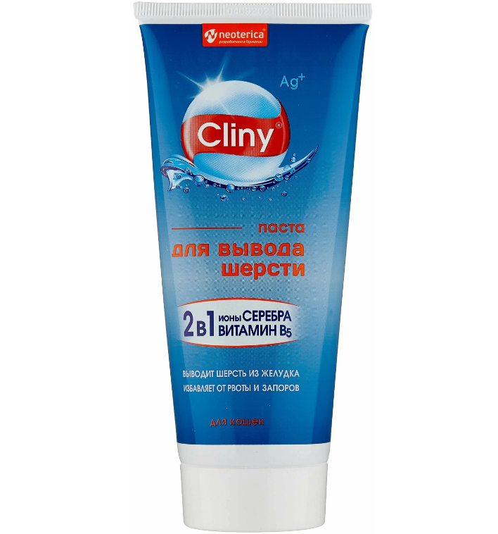 Паста для вывода шерсти Cliny способствует естественному выведению комков шерсти (безоаров) из желудка животных. Избавляет кошек от рвоты, потери аппетита, закупорки кишечника, запоров. Обладает привлекательным для кошек вкусом и ароматом курицы.