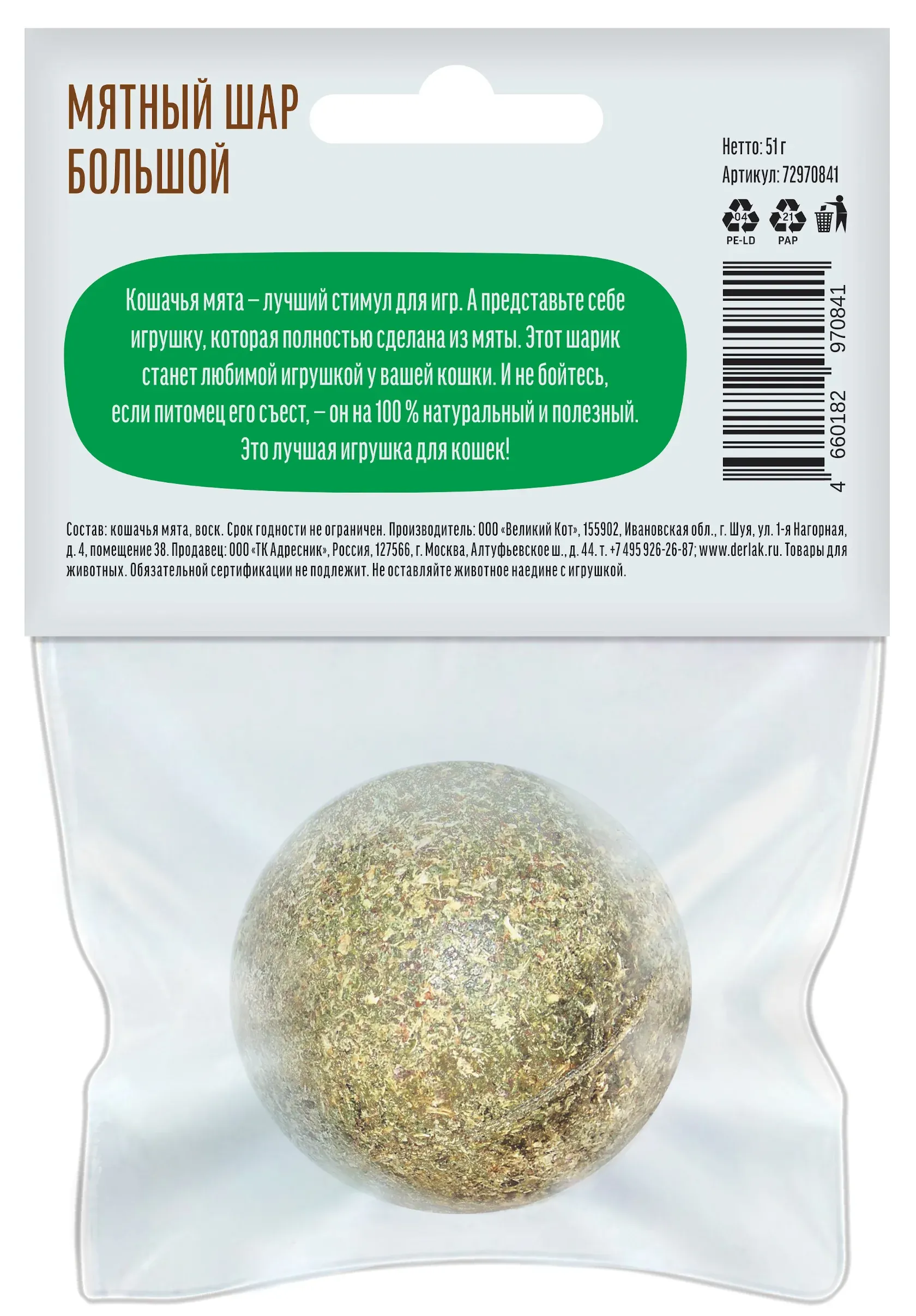 Деревенские лакомства, Мятный шар для кошек Большой 51 г