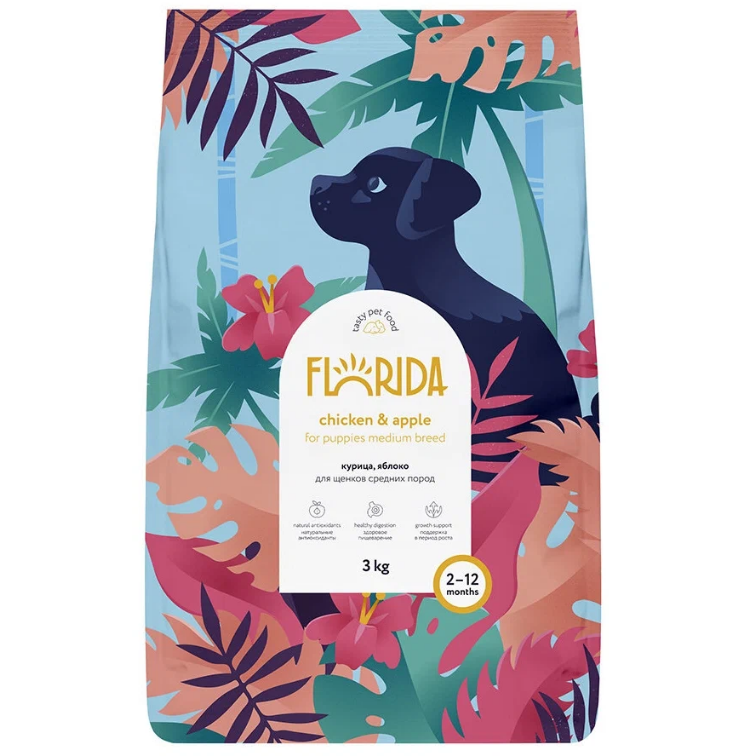 Florida Chicken and Apple - сухой корм супер-премиум-класса с курицей и яблоком для щенков средних пород. Сбалансированное полнорационное питание, способствующее правильному развитию щенка. В рационе кормов Florida используется только белок животного происхождения.Преимущества корма