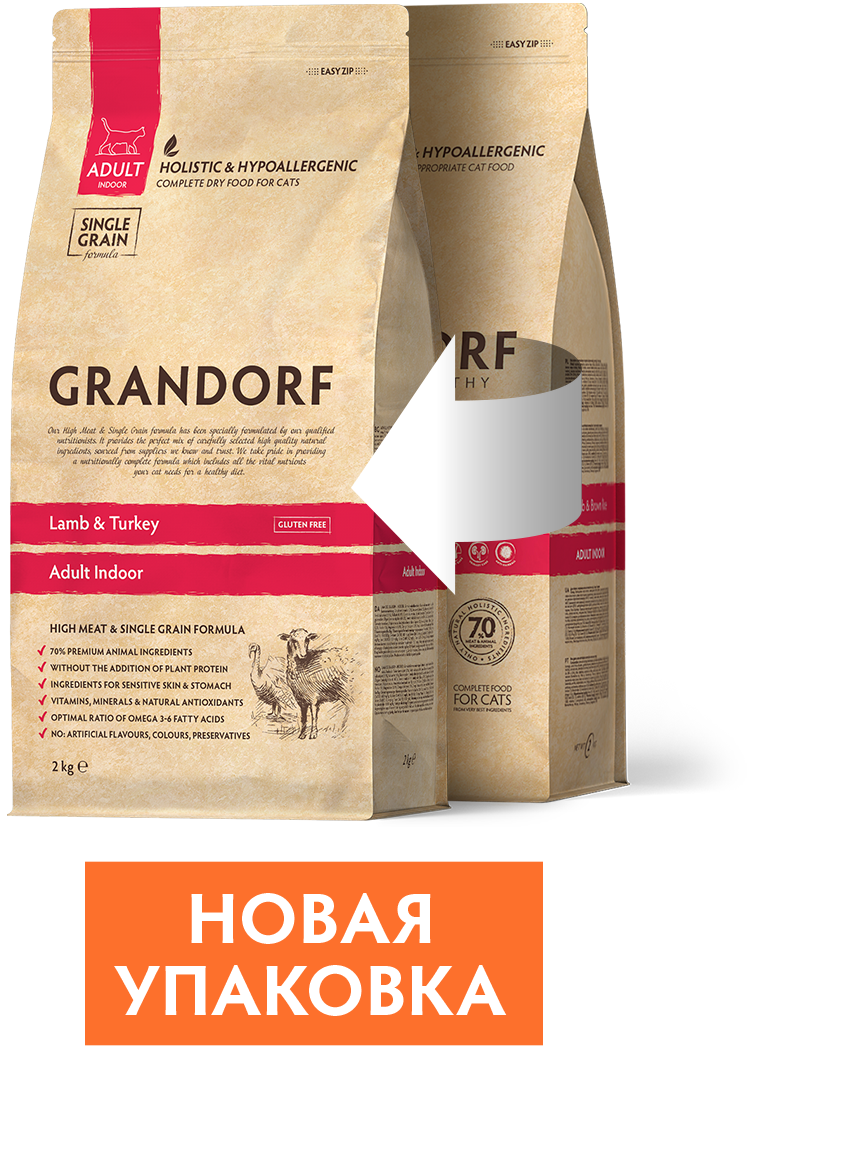 Грандорф для взрослых кошек с нормальной активностью, чувствительным пищеварением или склонных к аллергии.