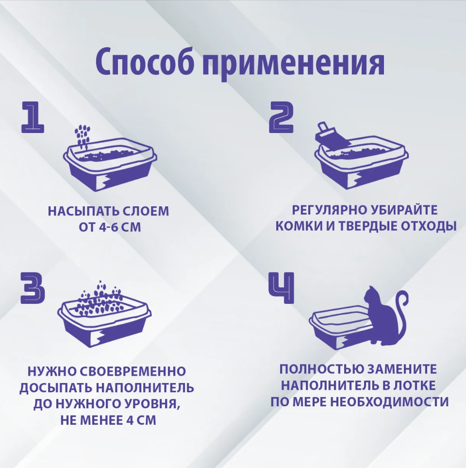 Прекрасно впитывает влагу и нейтрализует (а не маскирует) неприятные запахи. Комкуется в плотный комок, который достаточно лишь выбросить в унитаз и вам не придется менять все содержимое лотка.
