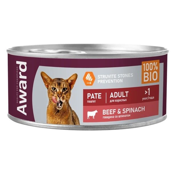 Консерва AWARD для взрослых кошек паштет из говядины со шпинатом