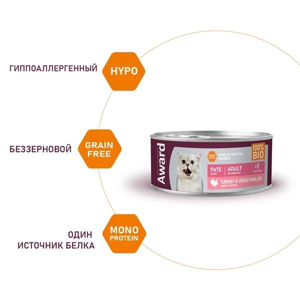 Консерва AWARD для взрослых кошек паштет из индейки с овощами