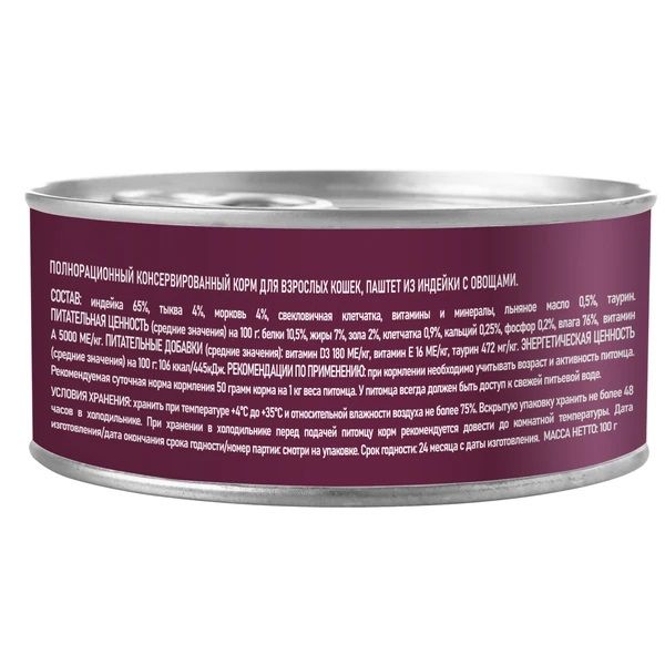 Паштет из индейки с кусочками овощей для взрослых кошек - это монопротеиновое сбалансированное питание для любимого питомца, изготовленое из одного вида мясного белка без содержания зерна и глютена, с добавлением овощей и фруктов богатых витаминами и минералами.