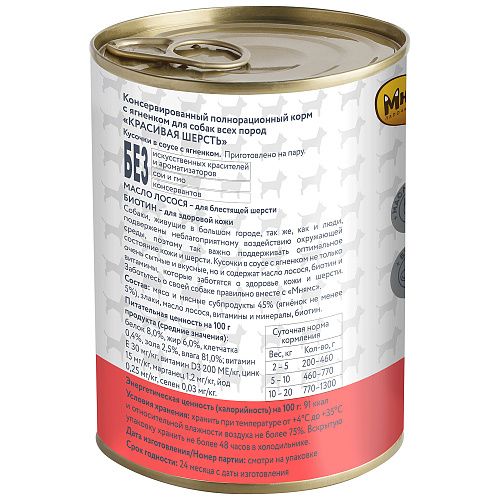 Мнямс влажный корм (консерва) для собак "Красивая шерсть" с ягнёнком 400 г