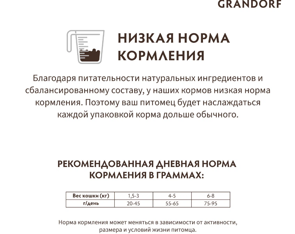Грандорф для взрослых стерилизованных кошек, кастрированных котов от 1 года и пожилых кошек с чувствительным пищеварением или склонных к аллергии.