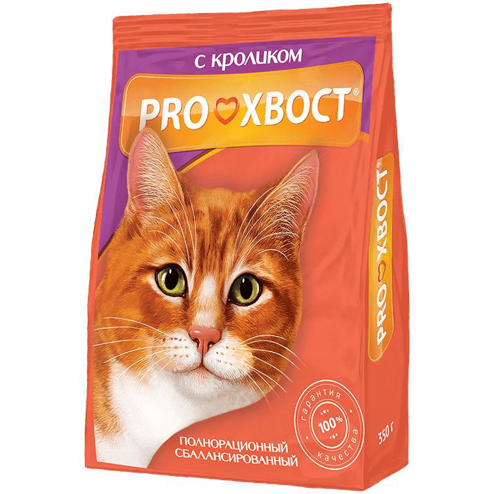 Корм "Прохвост" питательный (343 калории на 100 г). Быстро насыщает кошку полезной энергией для движений и игр.