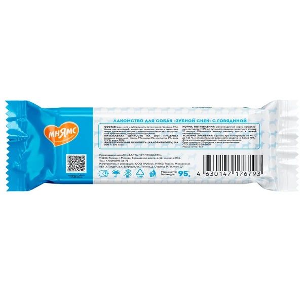 Мнямс DENTAL "Зубной снек"с говядиной – вкусное и полезное лакомство для взрослых собак крупных пород и щенков крупных пород старше 3-х месяцев. Обладает высокой вкусовой привлекательностью и прекрасной поедаемостью. Благодаря особой форме гарантирует тщательное очищение даже самых труднодоступных мест полости рта, предотвращает появление налета и обеспечивает профилактику появления зубного камня, обладает антибактериальным и освежающим действием, деликатно массирует десны.