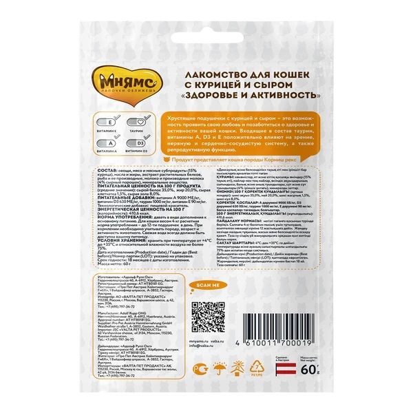 Лакомство Мнямс "Здоровье и активность" хрустящие подушечки для кошек с курицей и сыром 60 г