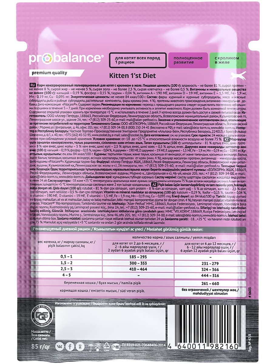 Пауч Probalance (Пробаланс) влажный корм (пауч) для котят с кроликом в желе 85 г