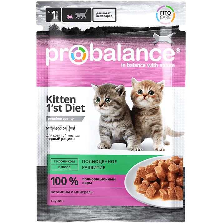 В состав консервированного корма ProBalance "Kitten 1`st diet" входит кролик, который считается диетическим мясом. Это источник железа, меди, витаминов и микроэлементов, которые необходимы для полноценного развития и роста котенка. Природные антиоксиданты, содержащиеся в кусочках мяса, способствуют укреплению иммунитета.