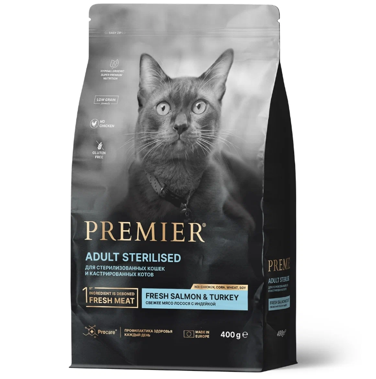 PREMIER (Премьер) сухой корм для стерилизованных кошек, Лосось, индейка 400 г