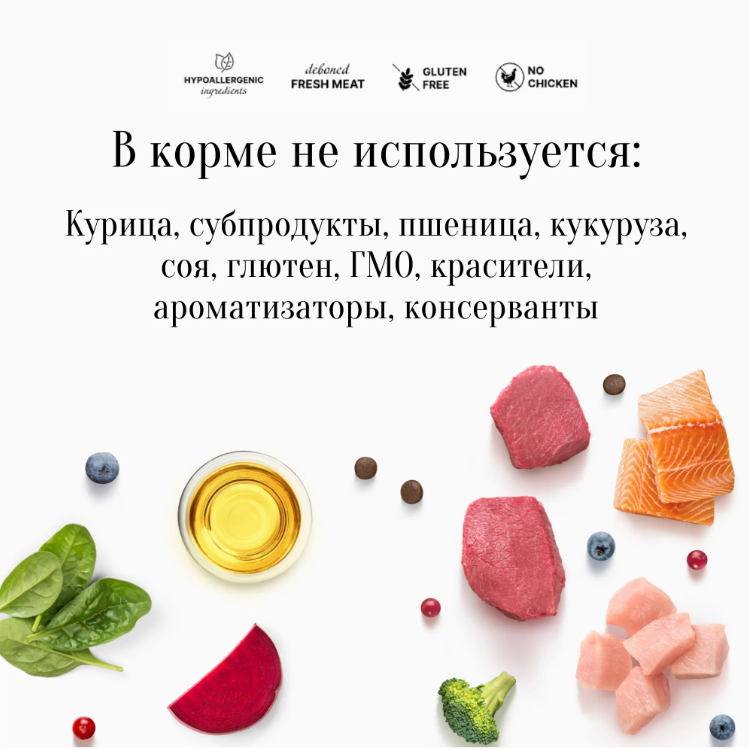 Свежее бескостное мясо индейки (25%), дегидрированное мясо индейки (25%), рис, горох, жир индейки (10%), свекла, порошок корней цикория (натуральный источник пребиотиков: FOS и инулин), минералы, пивные дрожжи (природный источник MOS и бета-глюканов), льняное семя, лососевое масло (0,5%), яблоки, клюква, черника, брокколи, шпинат, томаты, глюкозамина гидрохлорид (100 мг/кг), хондроитин сульфат (100 мг/кг), Юкка Шидигера, грейпфрут, розмарин, куркума.