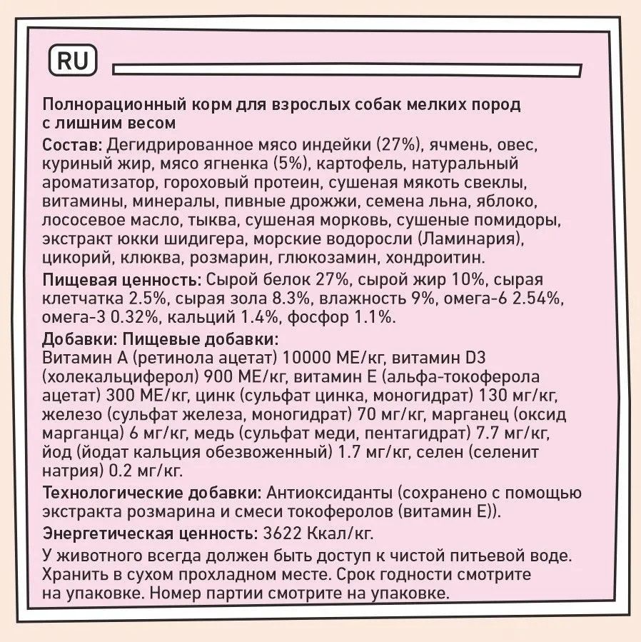 Состав:Дегидрированное мясо индейки (27%), ячмень, овес, куриный жир, мясо ягненка (5%), картофель, натуральный ароматизатор, гороховый протеин, сушеная мякоть свеклы, витамины, минералы, пивные дрожжи, семена льна, яблоко, лососевое масло, тыква, сушеная морковь, сушеные помидоры, экстракт юкки шидигера, морские водоросли (Ламинария), цикорий, клюква, розмарин, глюкозамин, хондроитин.